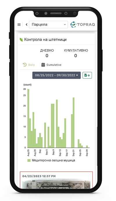 Сите обработени податоци се прикажуваат во корисничката платформа, каде што земјоделецот добива јасен и разбирлив преглед на бројот на штетници, нивната динамика низ времето (раст или опаѓање), како и навремени индикации за критичните периоди кога е потребна интервенција.